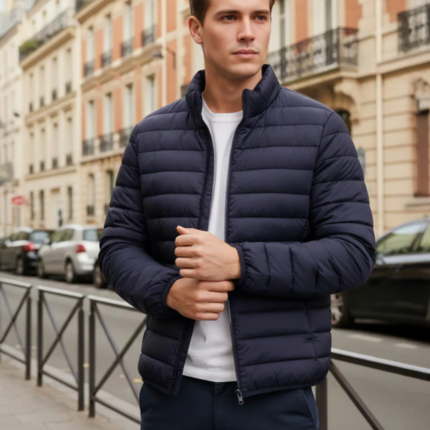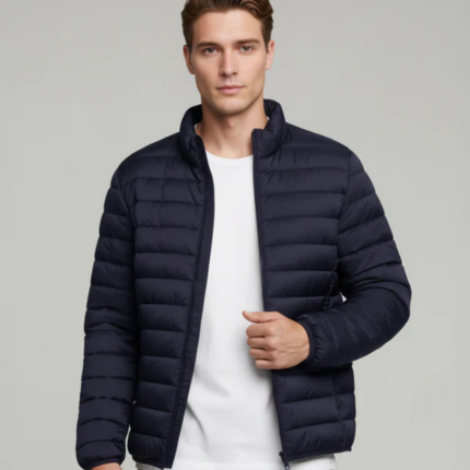 Men Navy Blue Solid Regular Fit Polyester Jackets
