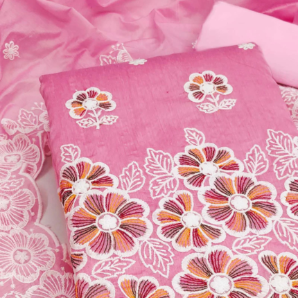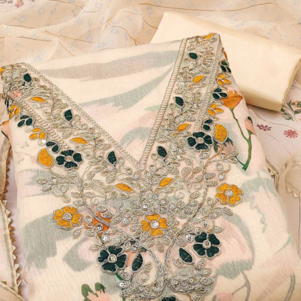 Cream Floral Embroidered Cotton Blend Dress Material