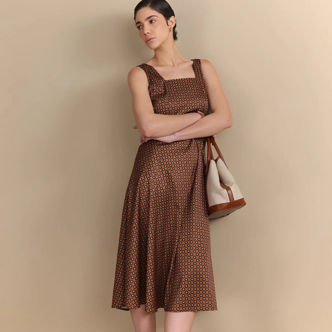 Sophisticated brown abstract print midi dress for artistic styling. A perfect balance of creativity and elegance.