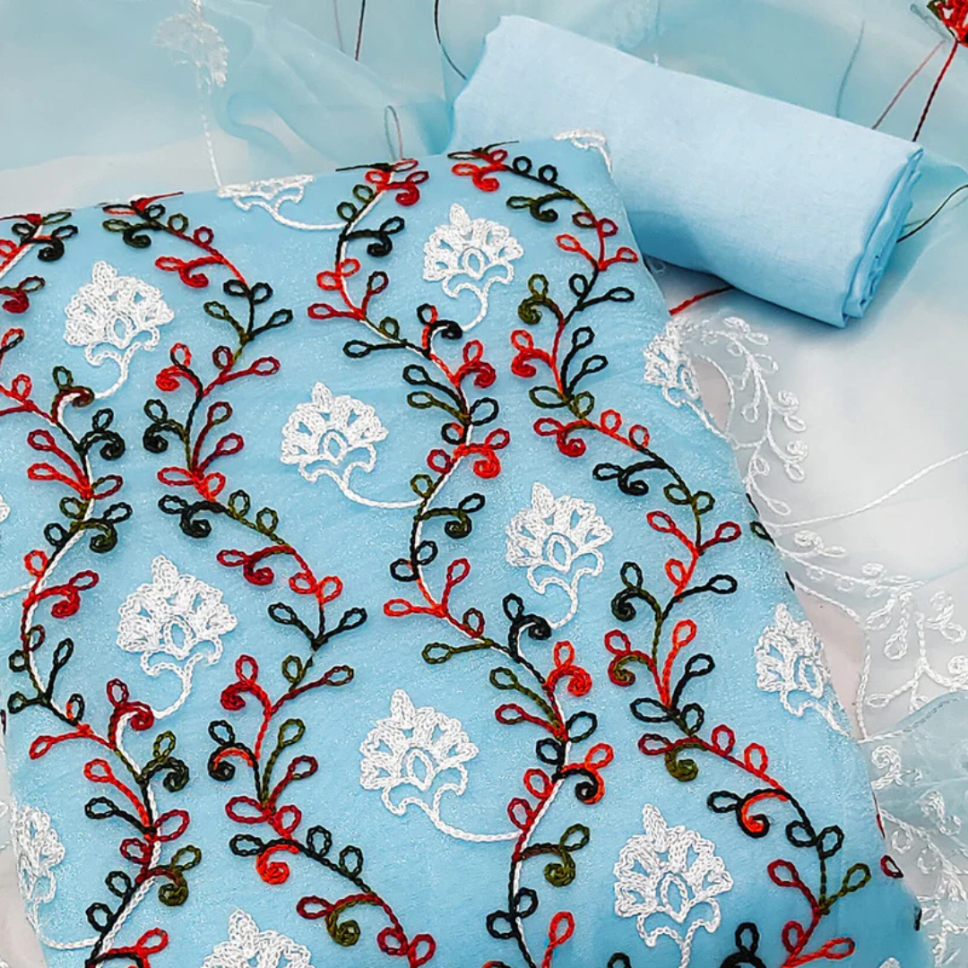 Elegant Blue Organza Dress Material Ensemble With Exquisite Floral Embroidery