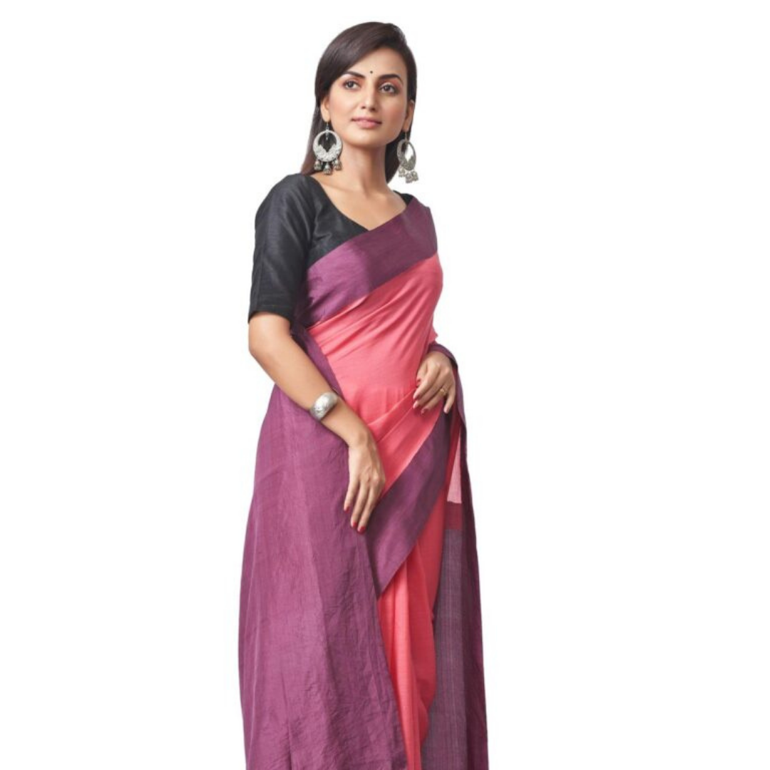 Experience the best of both worlds with this handwoven cotton-silk saree in a charming pink hue. The cutshuttle technique adds a unique, textured border.