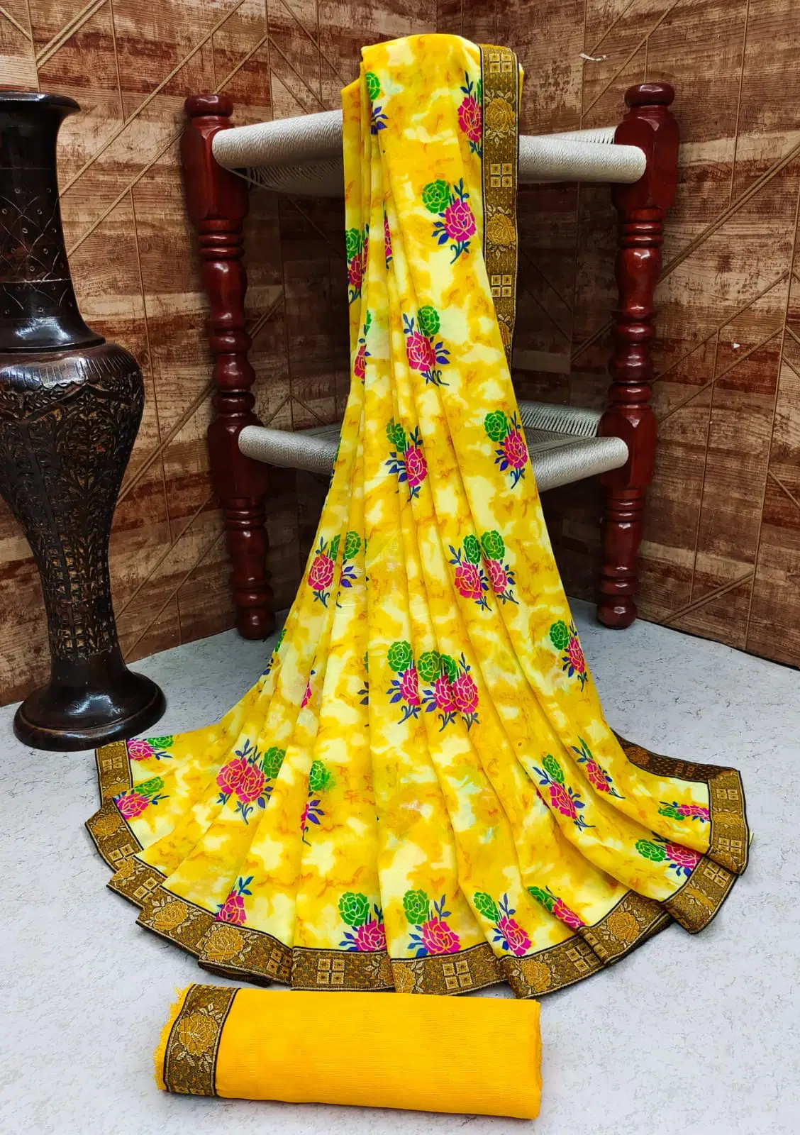 Kanooda Prints Georgette Printed Saree With Unstitched Blouse Piece ( Yellow )
