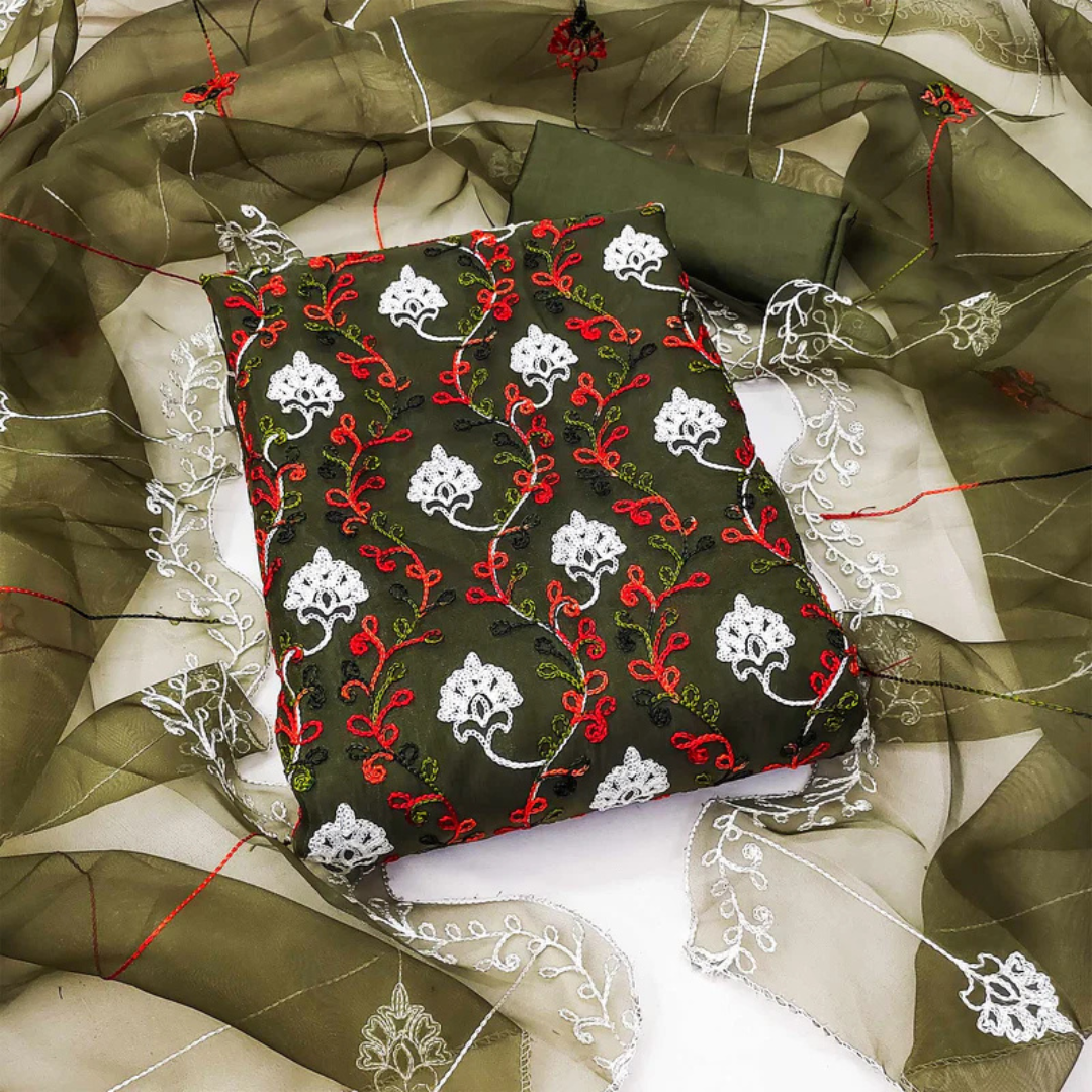 Mehendi green organza dress material adorned with exquisite floral embroidery. A refined festive statement.
