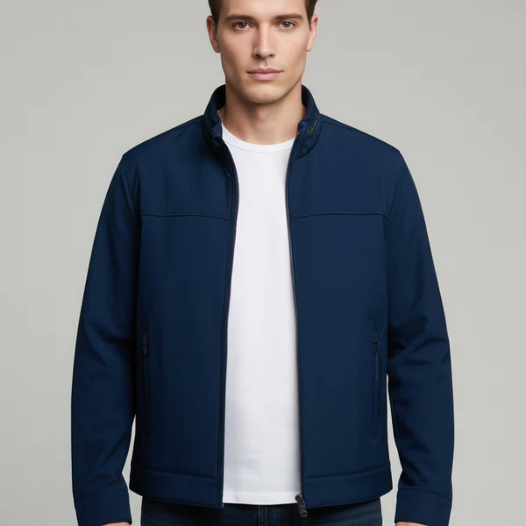 Men Navy Blue Solid Regular Fit Polyester Jackets