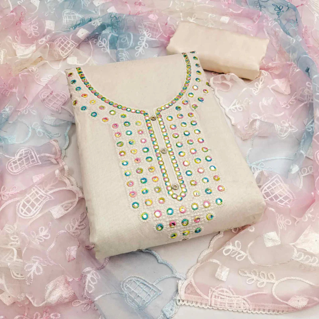 Luxurious off-white Chanderi dress material enriched with intricate thread embroidery. A timeless piece for graceful celebrations.