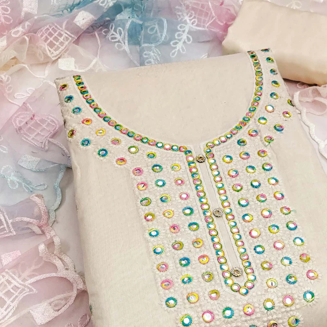 Be the first to review “Off White Designer Chanderi Dress Material with Intricate Thread Embroidery Detailing” Cancel reply