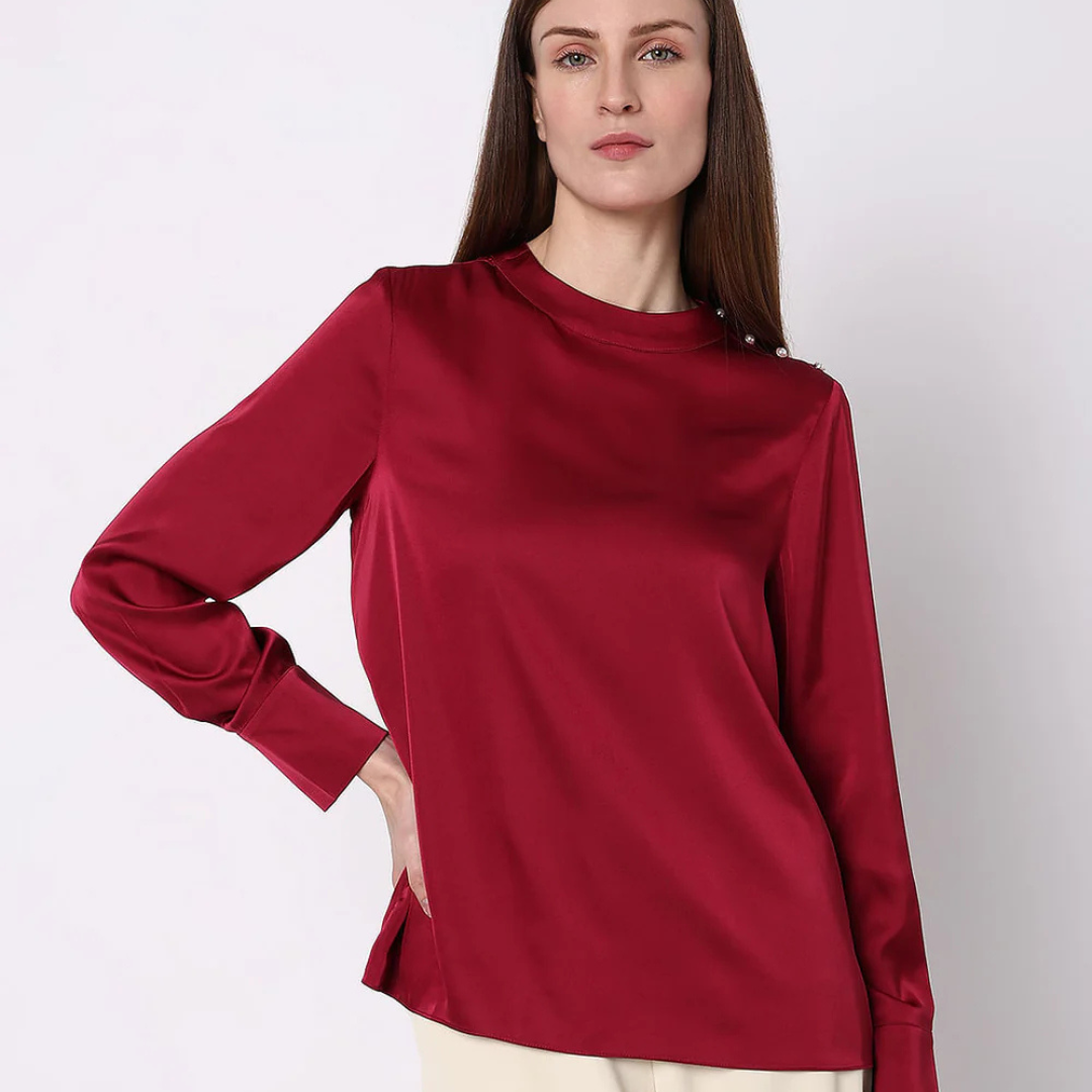 Make a powerful style statement with this red high neck satin top. The smooth satin fabric offers a soft and glossy finish. High neck design adds sophistication and elegance. Its vibrant red shade exudes confidence and charm. Ideal for parties, festive events, or special dinners. Comfortable fit ensures ease throughout the day. Pair it with black trousers or skirts for a dramatic and refined look.