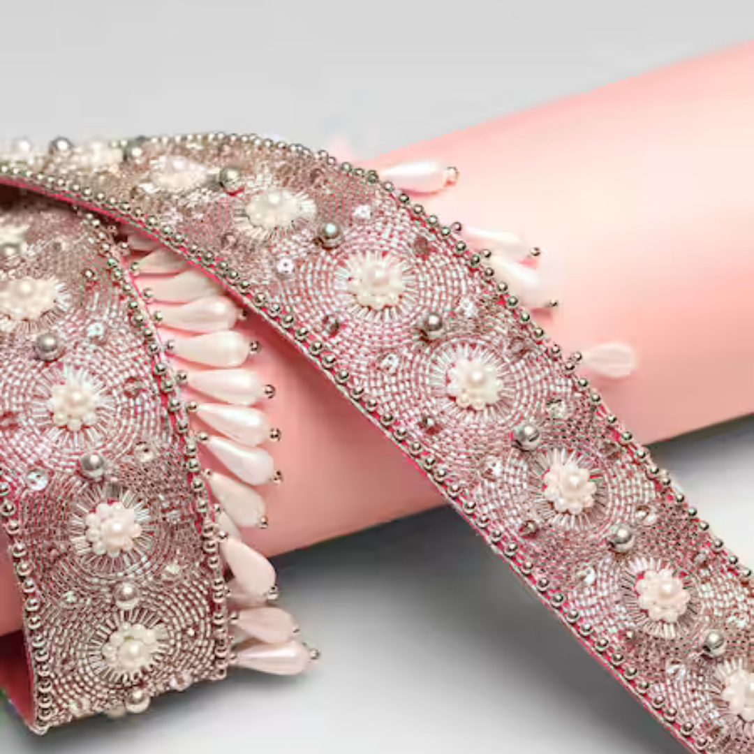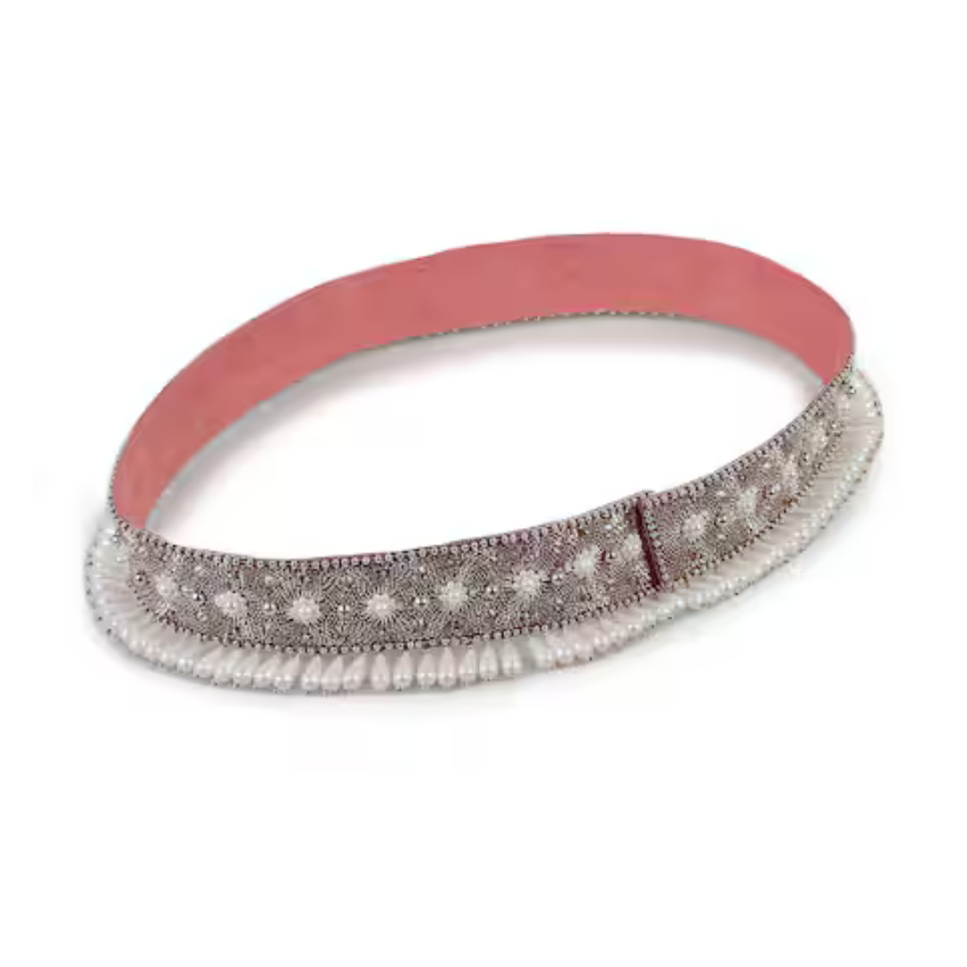 This opulent belt is a celebration of fine craftsmanship, combining the textured elegance of white smocking with the brilliant sparkle of Swarovski crystals and the classic beauty of pearls. Each element is meticulously hand-embroidered to create a rich, dimensional piece. Designed to cinch the waist of a bridal lehenga or saree, it adds an unforgettable touch of glamour and sophistication.