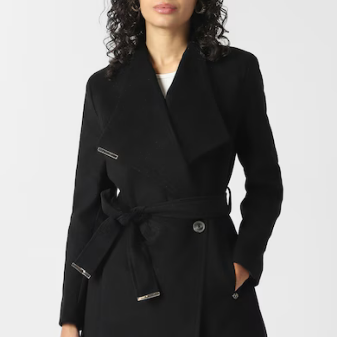 Stylish black trench coat with a waist belt for a flattering silhouette.